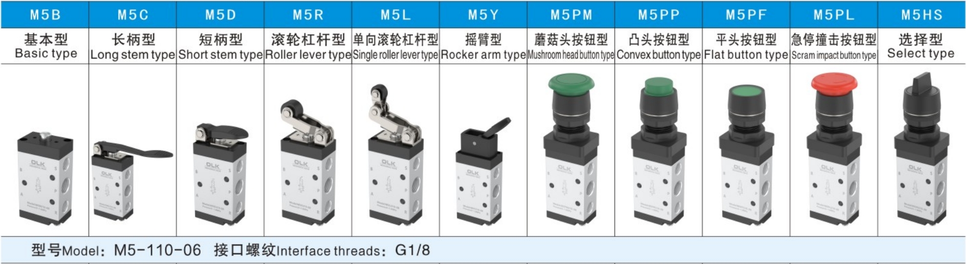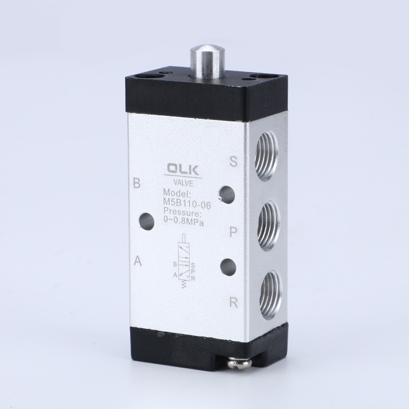 „AirTac“ tipo M5 serija 5/2 WAY MECHANINIS BUTUMO VOŽTUVĖS, KURIAS GAMINTAS OLK PNEUMATIC COMPANY.M5 Mechaninis vožtuvas yra stumdomos kolonėlės struktūra.