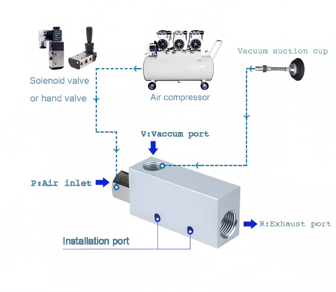 vakuuminiai siurbliai ir vakuuminiai generatoriai. Vakuuminis siurblys yra mechaninis įtaisas, kuris sukuria neigiamą slėgį siurbimo angoje ir leidžia išmetimo angai tiesiogiai pereiti per atmosferą, abiejuose galuose esant aukštam slėgio santykiui, kad būtų išgaunamos dujos. Vakuuminis generatorius yra pneumatinis komponentas, kuris naudoja suspausto oro srautą tam, kad susidarytų tam tikras vakuumo laipsnis. Palyginti su vakuuminiu siurbliu, jis turi paprastą struktūrą, mažą tūrį, lengvą svorį, mažą kainą, patogų montavimą, lengvą sujungimą su atraminiais komponentais, greitą vakuumo susidarymą ir išleidimą, tinkamas pertraukiamam darbui su mažu srautu, tinkamas pasklidusiam naudojimui.