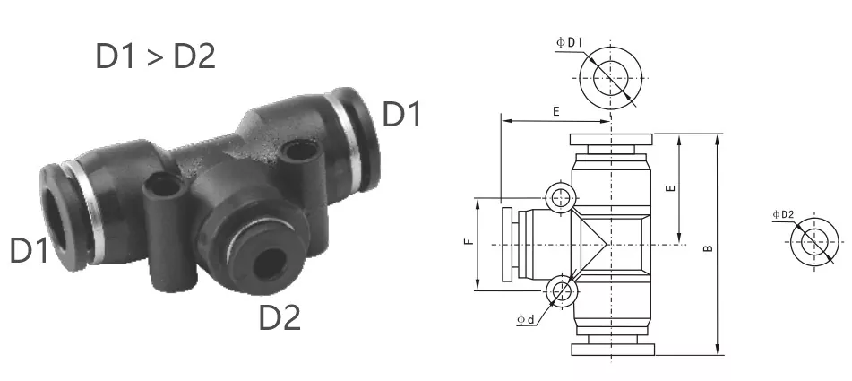 PE montavimas („Equal Tee Sąjunga“): Visi trys vamzdeliai turi tą patį išorinį skersmenį, tinkantį jungiant tris to paties dydžio pneumatinius vamzdelius.