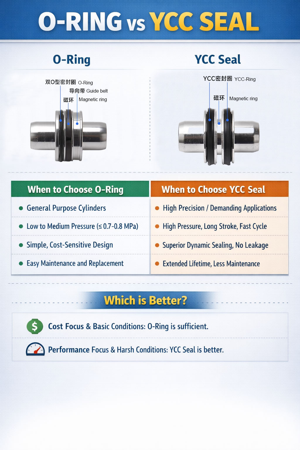 Palyginti su tradiciniais sandarinimo žiedais, YCC sandariklis užtikrina geresnį dinaminį sandarinimą ir atsparumą dilimui, todėl cilindras gali išlaikyti patikimą veikimą, kai keičiasi slėgis ir kartojasi ciklai. Tai žymiai sumažina ankstyvą nuotėkį ir pailgina priežiūros intervalus.