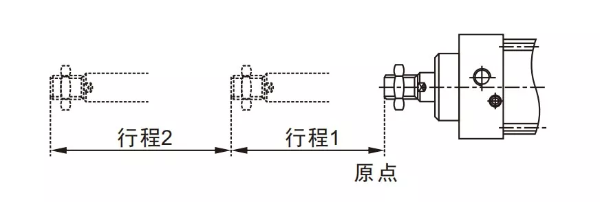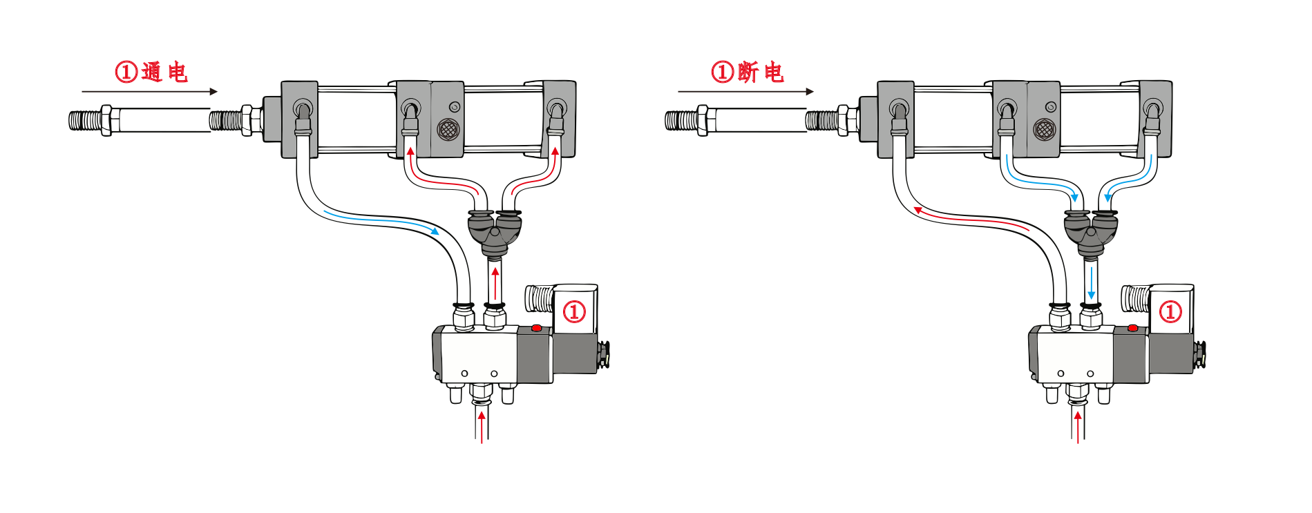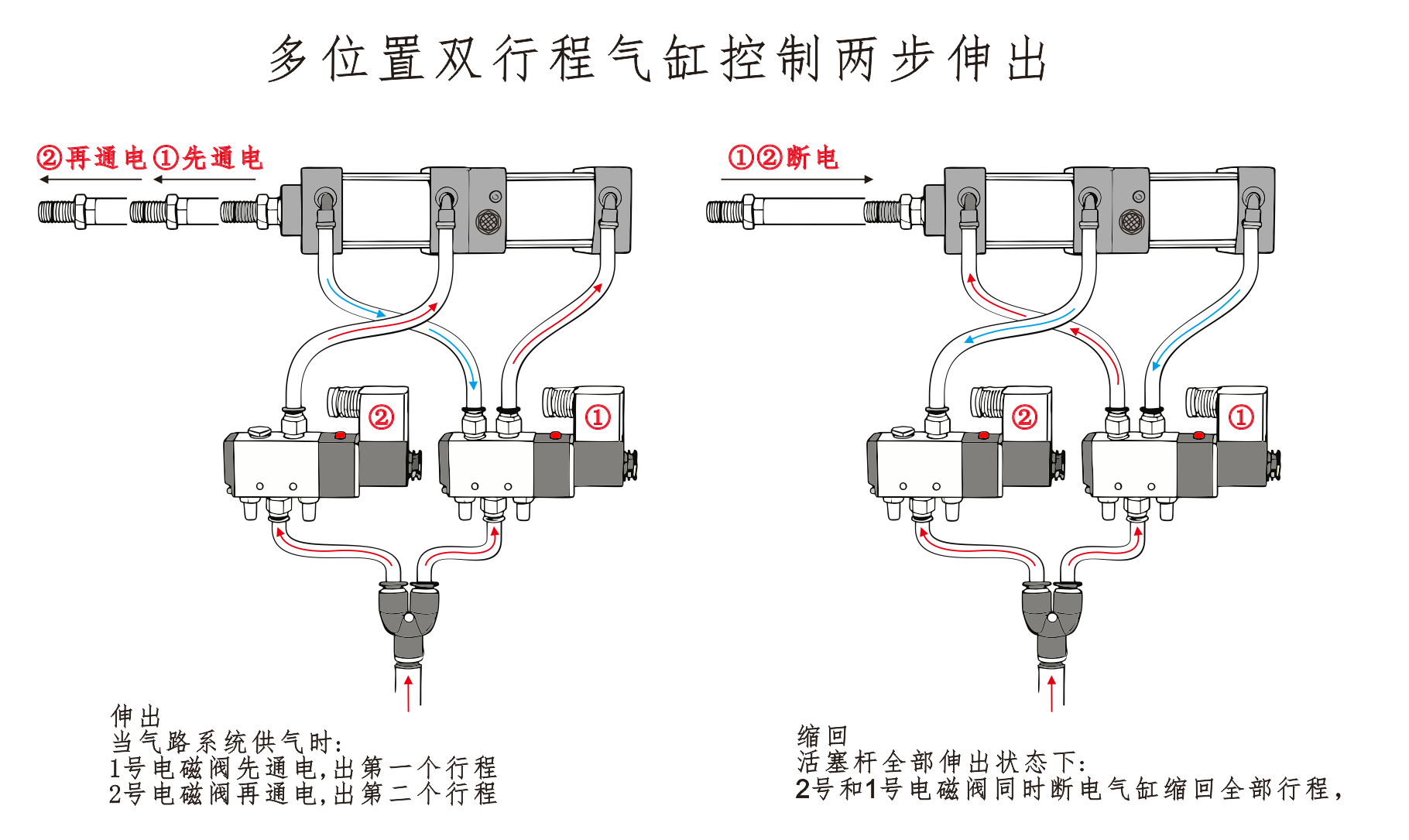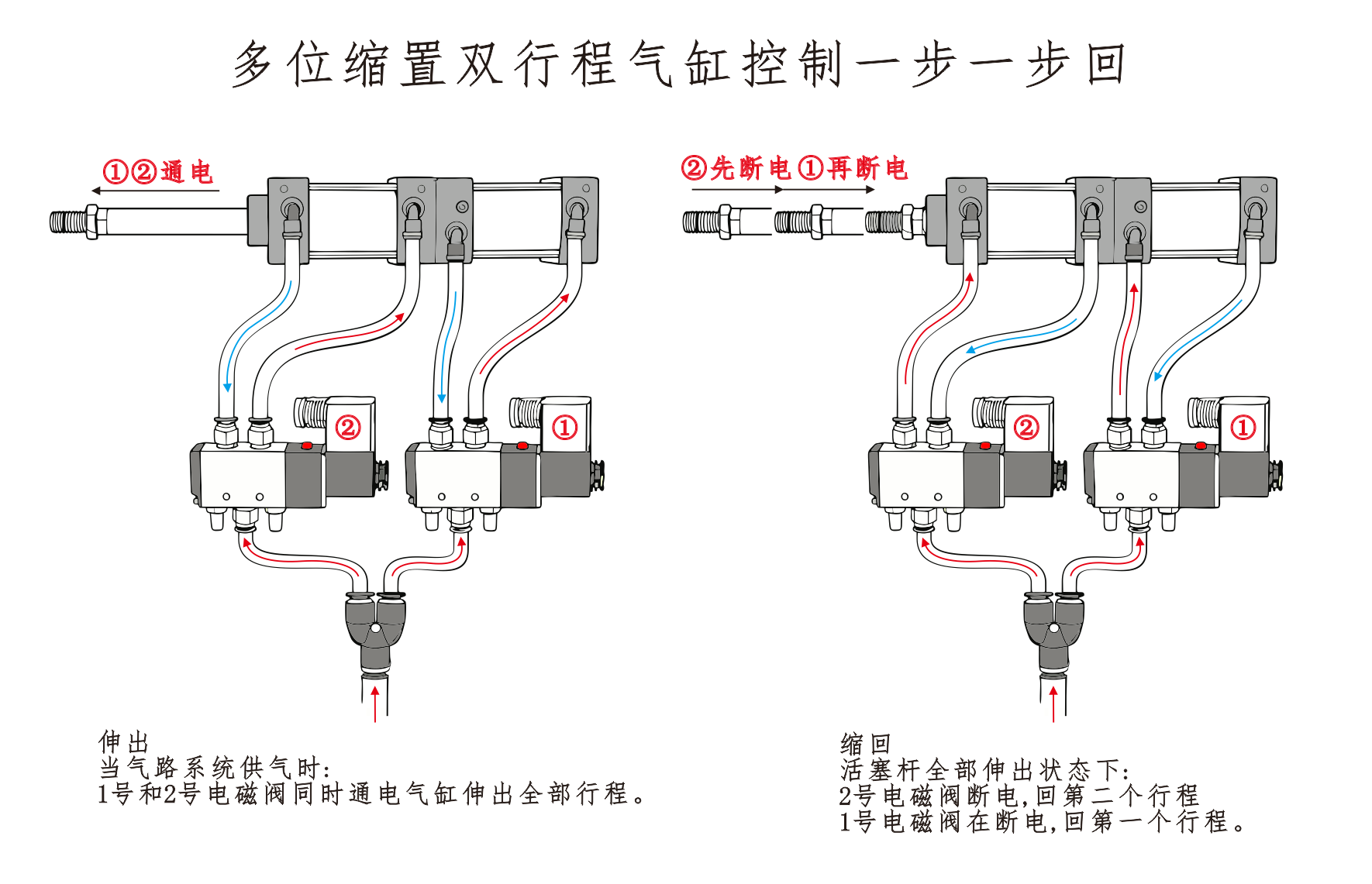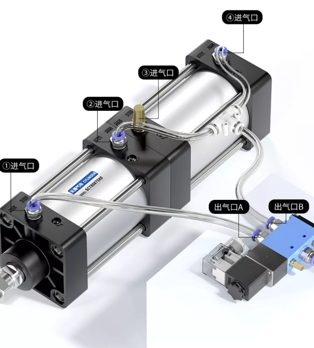 Cilindro ① oro įleidimo anga yra prijungta prie solenoidinio vožtuvo prievado A, o cilindro ④ oro įleidimo anga yra nuosekliai sujungta su solenoidinio vožtuvo prievadu B. Cilindro③ oro įleidimo anga yra sujungta su duslintuvu. Kai įjungiamas elektromagnetinio vožtuvo prievadas A, cilindrai lieka įtrauktoje padėtyje. Kai prievadas B įjungiamas, cilindrai pradeda veikti.