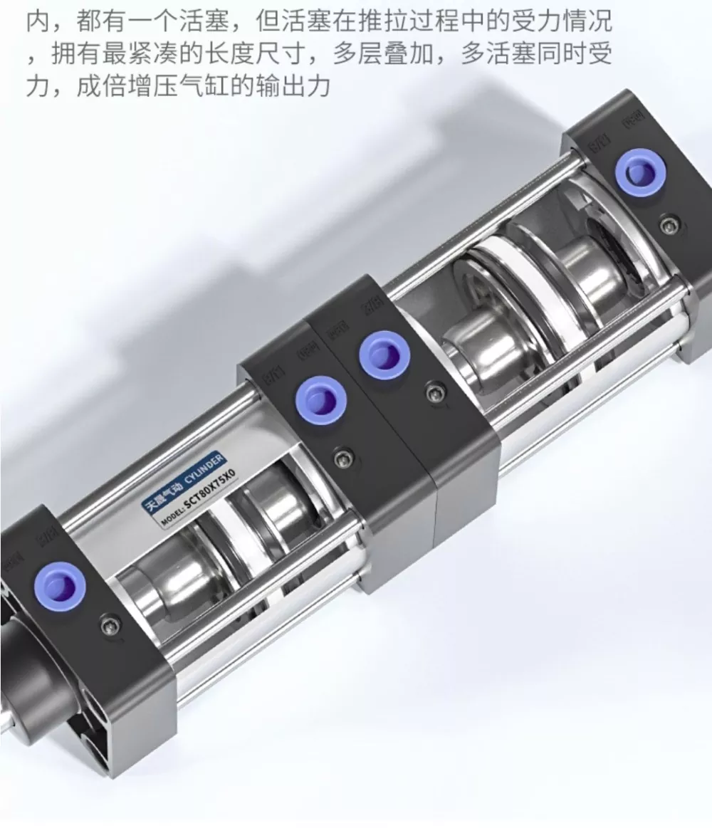 SCT vairo trauklės cilindras turi dvikrypčius YCC sandarinimo žiedus ir galingą dvitaktį dizainą, kompaktišką ir rafinuotą išvaizdą, užtikrinantį greitą veikimą ir sklandų bei stabilų išėjimą. Kiekviename cilindro sluoksnyje yra atskiras stūmoklis, o stūmimo ir traukimo proceso metu keli stūmokliai dalijasi apkrova, todėl cilindras pasiekia kompaktiškiausią ilgį ir sukuria padaugintą išėjimo jėgą dėl daugiasluoksnės sudėtinės konstrukcijos. Ši dvigubos jėgos konstrukcija užtikrina didesnę galią, o šešių sandarinimo žiedų konfigūracija užtikrina puikų sandarinimo efektyvumą, leidžiantį cilindrui išlaikyti iki 1,4 MPa slėgį be nuotėkio.