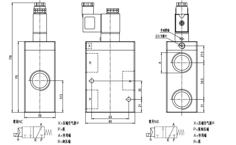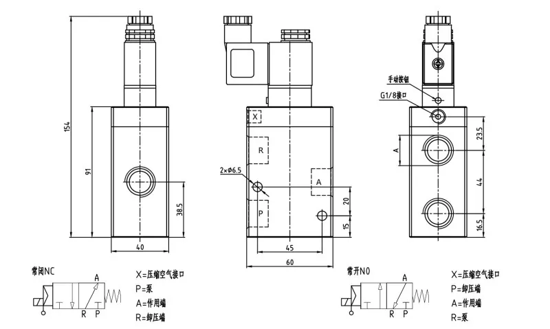 Srieginė prievado (P, A, R) dydžiai yra G3/8, G1/2 ir G1, su suslėgtu oro prievadu (x) G1/8.